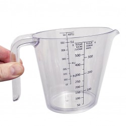 The 500ml graduated carafe, made of transparent plastic, is a practical and durable volume measure, ideal for quickly dosing liquids and powdered ingredients.
